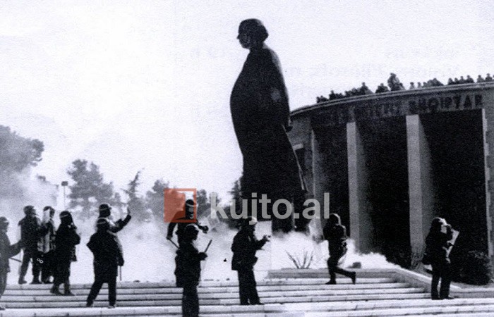 Më 20 shkurt 1991, u shembën me protestë masive popullore monumentet e Enver Hoxhës, në Tiranë dhe në Korçë, si dhe bustet në Fier, Durrës (port), Shijak, si dhe pati orvatje për të hequr monumentin e Gjirokastrës.