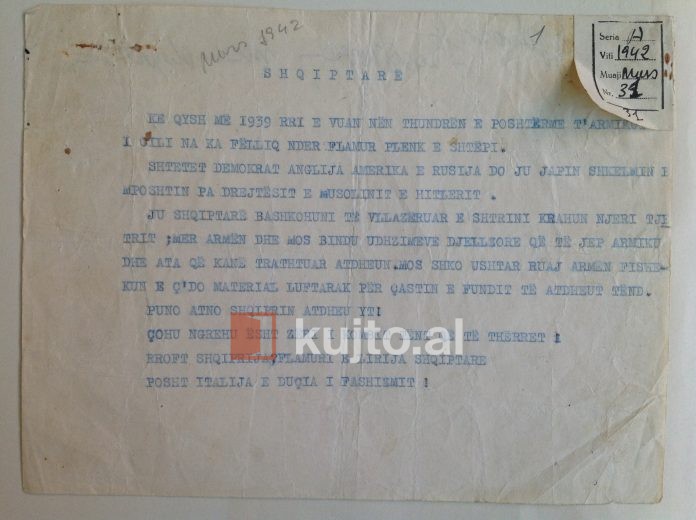 Viti 1942, Muaji mars, Nr. 31 SHQIPTARË Ke qysh më 1939 rri e vuan nën thundrën e poshtërme t’armikut i cili na ka fëlliq nder flamur plenk e shtëpi. Shtetet demokrat Anglija Amerika e Rusija do ju japin shkelmin e mposhtin pa drejtësit e Musolinit e Hitlerit. Ju shqiptarë bashkohuni të vllazëruar e shtrini krahun njeri tjetrit; mer armën dhe mos bindu udhzimeve djellzore që të jep armiku dhe ata që kanë trathtuar Atdheun. Mos shko ushtar ruaj armën fishekun e ç’do material luftarak për çastin e fundit të Atdheut tënd. Puno atno Shqiprin Atdheu yt! Çohu ngrehu ësht zëri i Kombit tënt që të thërret! Rroft Shqiprija, flamuri e lirija shqiptare! Posht Italija e Duçia i fashizmit!