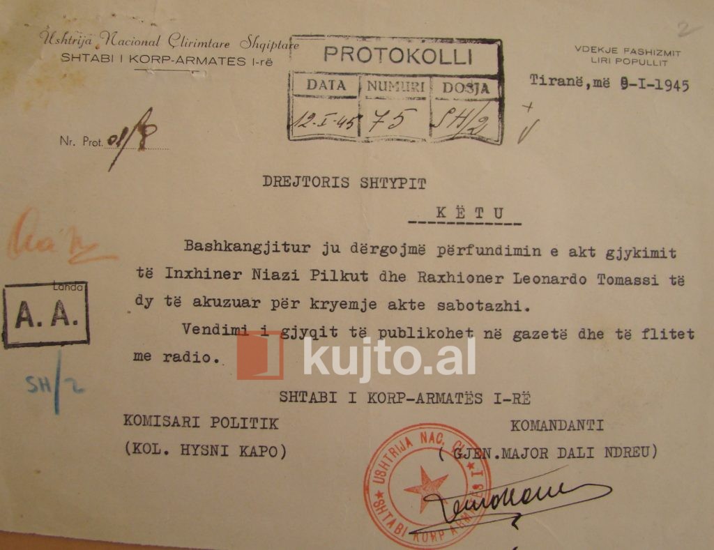 Duke u gdhirë 9 janari i vitit 1945, do të shënoheshin dy ekzekutimet e para me gjyqe politike në Shqipërinë e regjimit komunist. Të pushkatuarit ishin një inxhinier shqiptar, Niazi Mehmet Pilku i lindur më 1900 në Dibër dhe sipërmarrësi italian Leonardo Tomasso i lindur më 1900 në Palermo, administrator i firmës “Italstrada” i ardhur në Shqipëri që në vitin 1939.