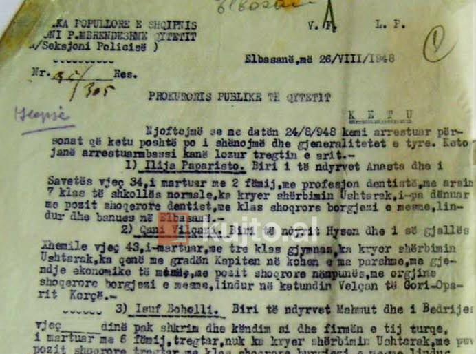 Seksioni i Punëve të Brendshme të qytetit të Elbasanit, i drejtuar nga major Kopi Niko, me shkresën e datës 26.8.1948 i kërkonte Prokurorisë Publike të atyshme lëshimin e mandateve të arrestit mbi disa persona që ishin arrestuar për tregtinë e arit: