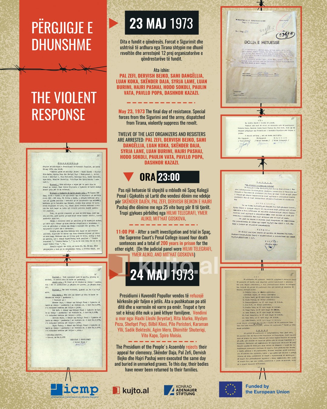 23 maj 1973, dita e fundit e qëndresës. Forcat e Sigurimit dhe ushtrisë të ardhura nga Tirana shtypin me dhunë revoltën dhe arrestojnë 12 prej organizatorëve e qëndrestarëve të fundit.