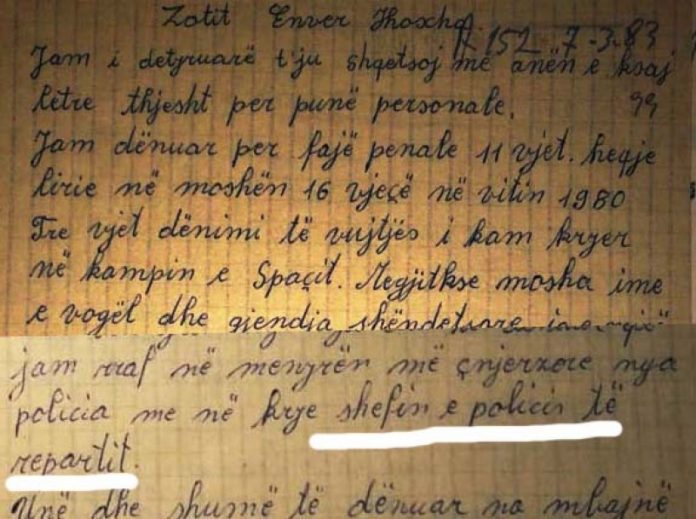 Jam i detyruar t’ju shqetësoj me anën e kësaj letre, thjesht për punë personale. Jam i dënuar për faje penale (me) 11 vjet heqje lirie në moshën 16 vjeç në vitin 1980. Tre vjet dënimi të vuajtjes i kam kryer në kampin e Spaçit. Megjithëse mosha ime është e vogël dhe gjendja shëndetësore jo e mirë, unë atje kam punuar dhe nuk jam bërë shembull i keq kurrë. Thëniet e mia vërtetohen se gjatë kohës së qëndrimit në Spaç nuk është marrë asnjë masë disiplinimi dhe e kam realizuar normën. Më datën 23 janar (1980) unë transferohem në kampin e Qafë Barit. I shtyrë nga rrethanat e këtij kampi po detyrohem t’ju vë në dijeni kushtet e punës që në përgjithësi janë të tmerrshme. Unë nuk jam i aftë t’ju shpjegoj në hollësi, por po prek ato më kryesoret. Frontet e punës në minierë ku punojmë janë të mbytura me ujë. Frontet e punës nuk janë në gjendjen pune. Nuk gjendet mineral për të realizuar normën e detyruar. Detyrohemi me forcë për të punuar në hapësirë në kundërshtim me rregulloren e sigurimit teknik, ku na rrezikohet jeta çdo sekondë. Prezenca e ujit në frontet e punës që e vështirëson realizimin e normës nuk merret parasysh. Edhe kur nuk ka mineral, policia thotë dua normën, gjeje ku të duash. Banjot për t’u larë kur mbarojmë punën funksionojnë me ujë të ftohtë për mungesë të lëndës djegëse. Kjo është minierë piriti që trupi futet e lahet vetë me ujë të ngrohtë, ndryshe nuk del pisllëku. Banjot janë jashtë dhe po të bësh dush me ujë të ftohtë merr plevitin. Ushqimi që na është garantuar nuk na jepet në rregull. Nga vidhet ose shpërndahet, unë nuk e di këtë. Si rrjedhim i të gjithë këtyre faktorëve, norma është e parealizueshme dhe ky është fakt se mbi 80% e të dënuarve nuk e realizojnë normën. Për mendimin tim, fajin e ka personeli inxhiniero-teknik që e kanë katandisur minierën në këtë gjendje dhe drejtoria e ndërmarrjes që janë dhe do të jenë përgjegjës për të gjitha pasojat që do të ndodhin. Në qoftë se do të vihet dorë, komanda e repartit duke u ndodhur përpara këtyre vështirësive dhe e paaftë për të zgjidhur gjërat me bindje dhe në rrugë partie, ka futur dhunën dhe terrorin në kamp, duke rrahur çdo ditë të dënuarit me kamxhik në mënyrë çnjerëzore. Shkel çdo ligj, çdo të drejtë njerëzore. Na lënë dy turne në galeri, na heqin zvarrë nëpër galeri dhe na rrahin pa mëshirë. Disa të dënuar kanë mbetur me të meta fizike nga kamxhiku-zorra e trashë- siç e quajnë policia. Unë vetë jam një nga ata të dënuar që jam rrahur në mënyrën më çnjerëzore nga policia me në krye shefin e policisë së repartit (Edmond Caja-shënim). Unë dhe shumë të dënuar, na mbajnë me dy turne në galeri pa bukë. Ne padyshim japim maksimumin, po nuk e arrijmë dot atë që kërkohet. Gjendja fizike dhe shëndetësore është shumë e keqe, por këtu nuk merret asgjë parasysh. Deri kur do të vazhdojë kjo gjë unë nuk e di, por dua të them se çdo gjë ka një kufi, dua të theksoj se kjo minierë në këto kushte nuk është kamp pune dhe riedukimi, por kamp shfarosjeje. Në qoftë se kjo gjendje do të vazhdojë kështu, të gjithë të dënuarit për një kohë të shkurtët dalin të pavlefshëm për veten e tyre, familjet e atdheun. Unë tash jam 19 vjeç, kam edhe 6 vjet burg për të bërë. Në kushte normale unë e ndiej veten të aftë të kryej këtë me punë dhe të kthehem pranë familjes t’i shërbej asaj, vetes dhe atdheut ku ka nevojë. Unë kam lexuar në literaturë se ne jemi një shtet human, me ligje njerëzore dhe të shenjta. Kush i shkel ato e pëson. Në këtë kamp ne nuk na mbron asnjë ligj. Kam besim se partia këto gjëra do t’i zgjidhë sa më shpejt. Këto që po ndodhin në Qafë Bari nuk i shërbejnë kurrkujt përveçse armiqve të Shqipërisë.