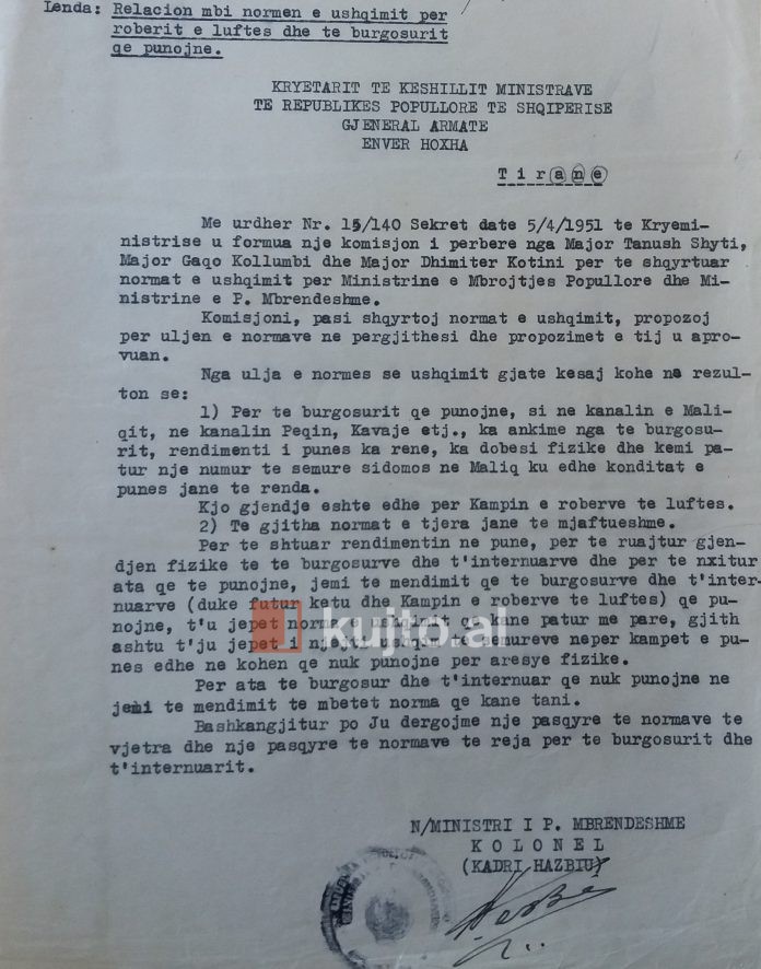 Që të burgosurit dhe të internuarit jetonin në kushte çnjerëzore dhe kërcënoheshin nga uria e vazhdueshme, e vërteton edhe ky dokument zyrtar i nënshkruar nga Kadri Hazbiu në vitin 1951.