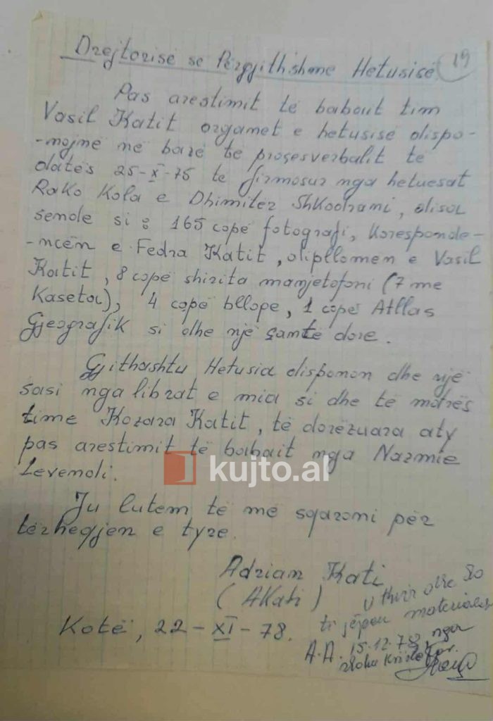 Djali i Vasil Katit, ish-ministrit të Tregtisë së Jashtme në vitet '60. Vasil Kati u arrestua në vitin 1975, kur mbante postin e zëvendësministrit të Tregtisë. Më pas, familja, përfshirë Adrianin, u internua në Ndërnenas, të rrethit të Fierit, për t'u zhvendosur më pas edhe në fshatra të tjerë. Siç tregon një letër ku Adriani kërkonte objektet personale të sekuestruara nga shtëpia e tyre, në dhjetor të vitit 1978, ai ndodhej në Kotë të Vlorës.