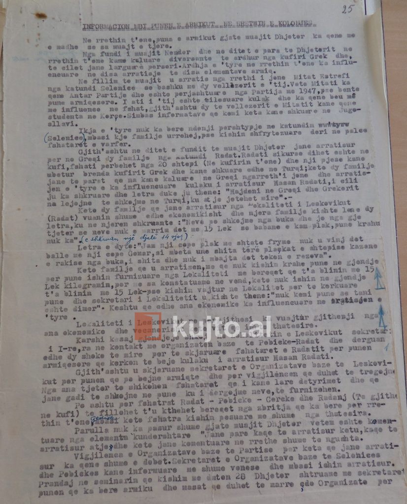 Gjithashtu në ditët e fundit të muajit dhjetor janë arratisur për në Greqi dy familje nga katundi Radat. Radati, sikurse dihet është në kufi. Fshati përbëhet nga 20 shtëpi (në kufirin tonë) dhe nji pjesë kanë mbetur mbrenda kufirit grek dhe kanë shkuar edhe në Turqi; këto dy familje janë të parat që na kanë kaluar në Greqi nga rrethi i jonë dhe arratisjen e tyre e ka influencuar kulaku i arratisur Hasan Radati i cili ju ka shkruar edhe letra duke ju thënë: hajdeni në Greqi dhe grekërit na lejojnë të shkojmë në Turqi, ku atje jetohet mirë”. –